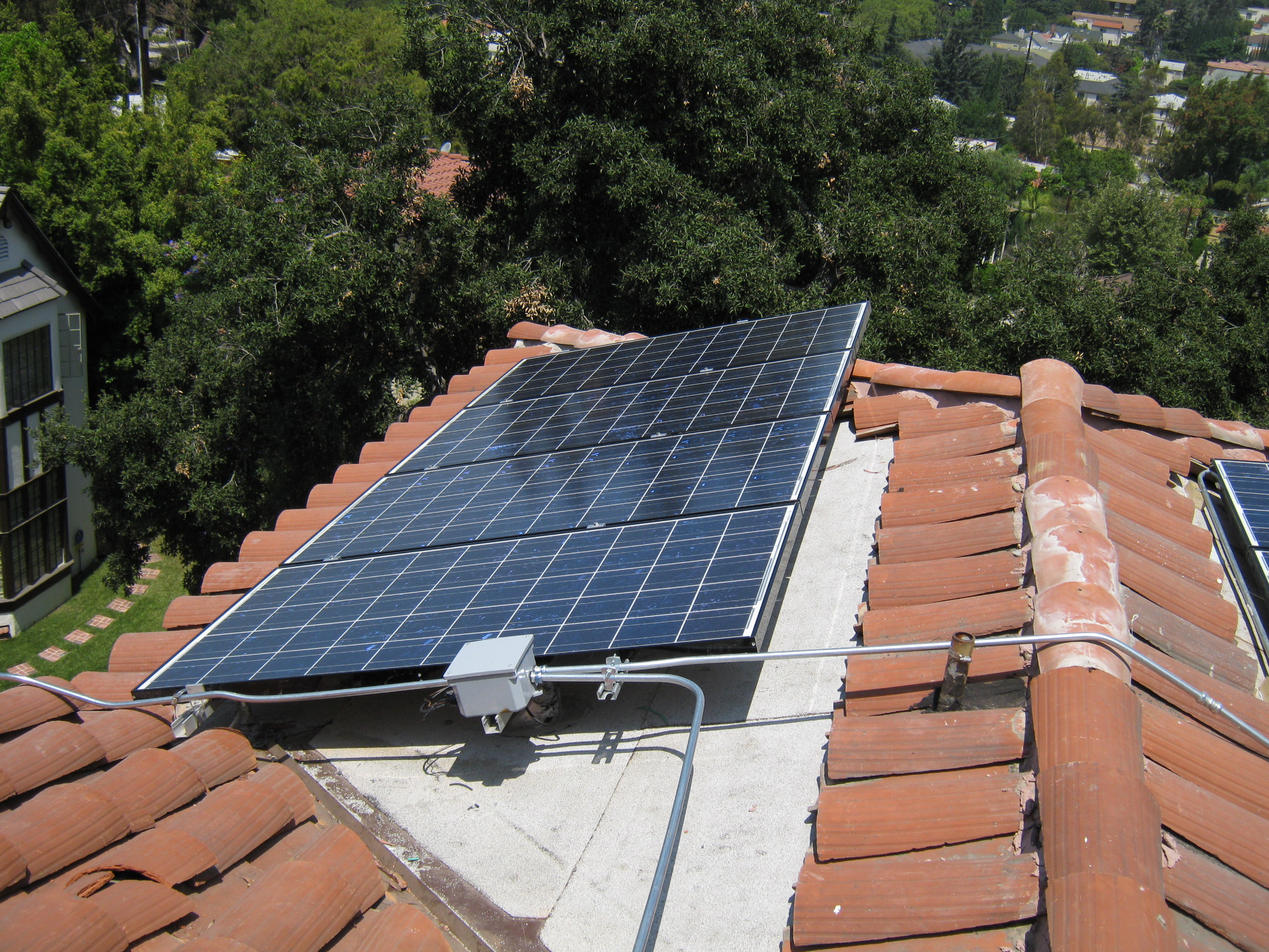System Size DC: 3,960 DC Watts This system was designed with 22 Schuco Solar S 180-SPU-4 180 watt solar panels with 11 panels per string connecting to a Sunnyboy 4000 watt DC/AC Inverter. This installation uses the West roof surface with equal strings of 11. Permitting Issues: None, The City of LA Building was ok. LA Fire gave us "Secret double exemption" for our project... What a croc. Time of Use Metering? Yes. Time of Use Metering means that between 12 noon and 6 PM your electricity rate goes up dramatically. For solar producers this means every time you spin the meter backwards you are getting a credit at the much higher Time-of-Use (TOU) rate. |